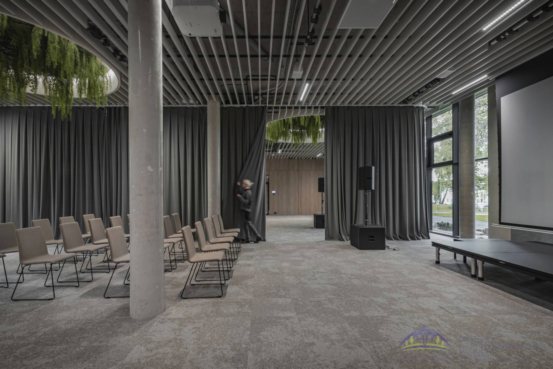 Bendradarbystė ir susitikimai: bendradarbystės zona (72 m2) su virtuve ir pasitarimų kambariu (20 m2), kurioje yra aštuonios stacionarios darbo vietos. Čia stovi reguliuojami elektriniai darbo stalai, ergonominės darbo kėdės, spausdintuvas ir kopijavimo aparatas, pasitarimų kambaryje – ekranas su nuotolinių konferencijų įranga. Konferencijų salėje (300 m2, iki 200 vietų) – moderni vaizdo ir garso įranga, akustinės užuolaidos.