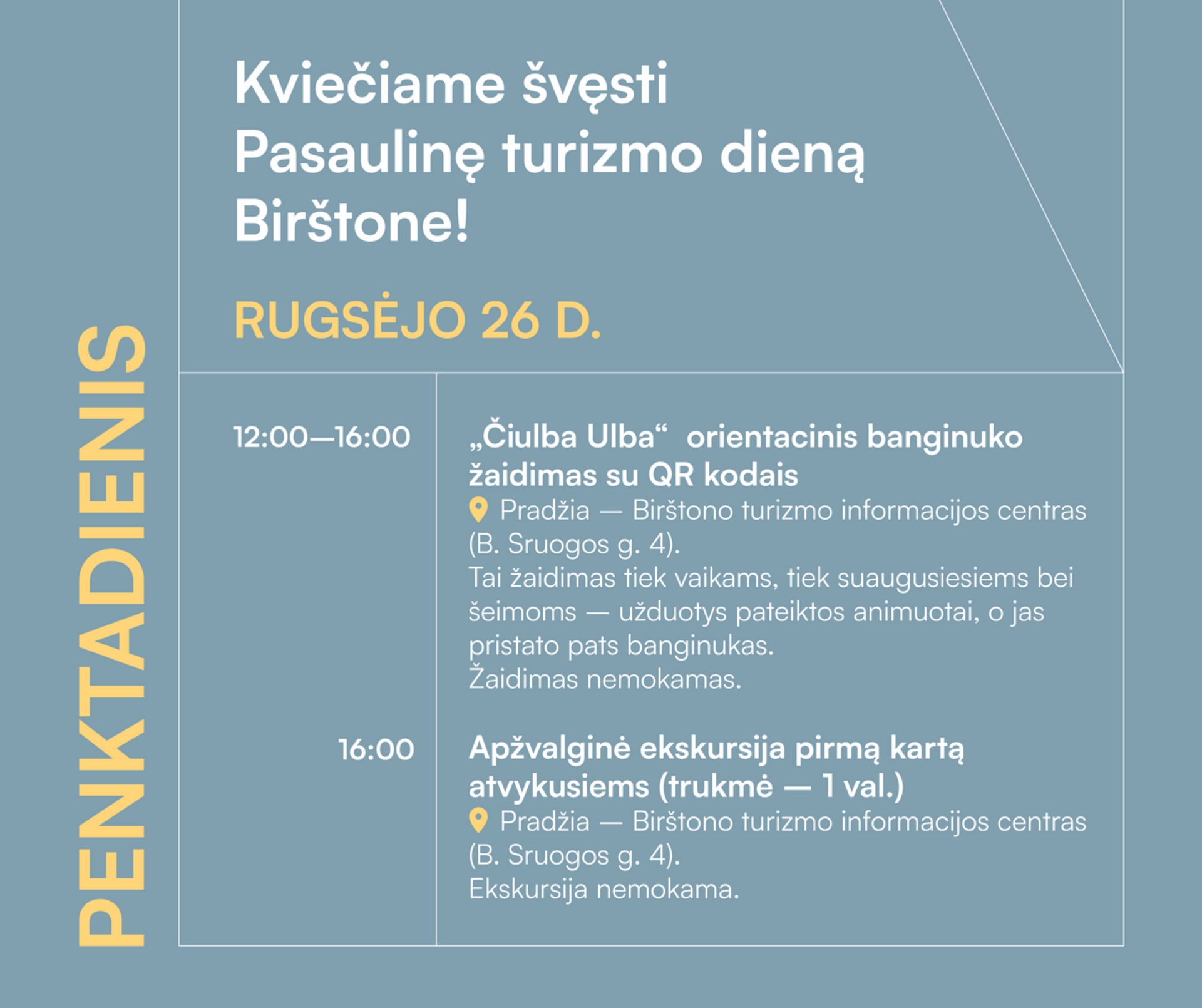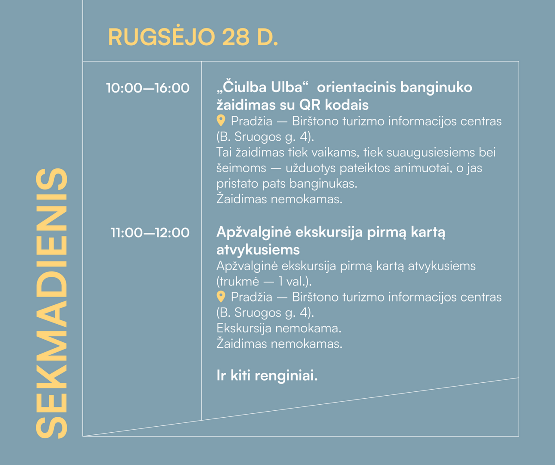 10:00–16:00 „Čiulba Ulba“ orientacinis banginuko žaidimas su QR kodais. Pradžia – Birštono turizmo informacijos centras (B. Sruogos g. 4).