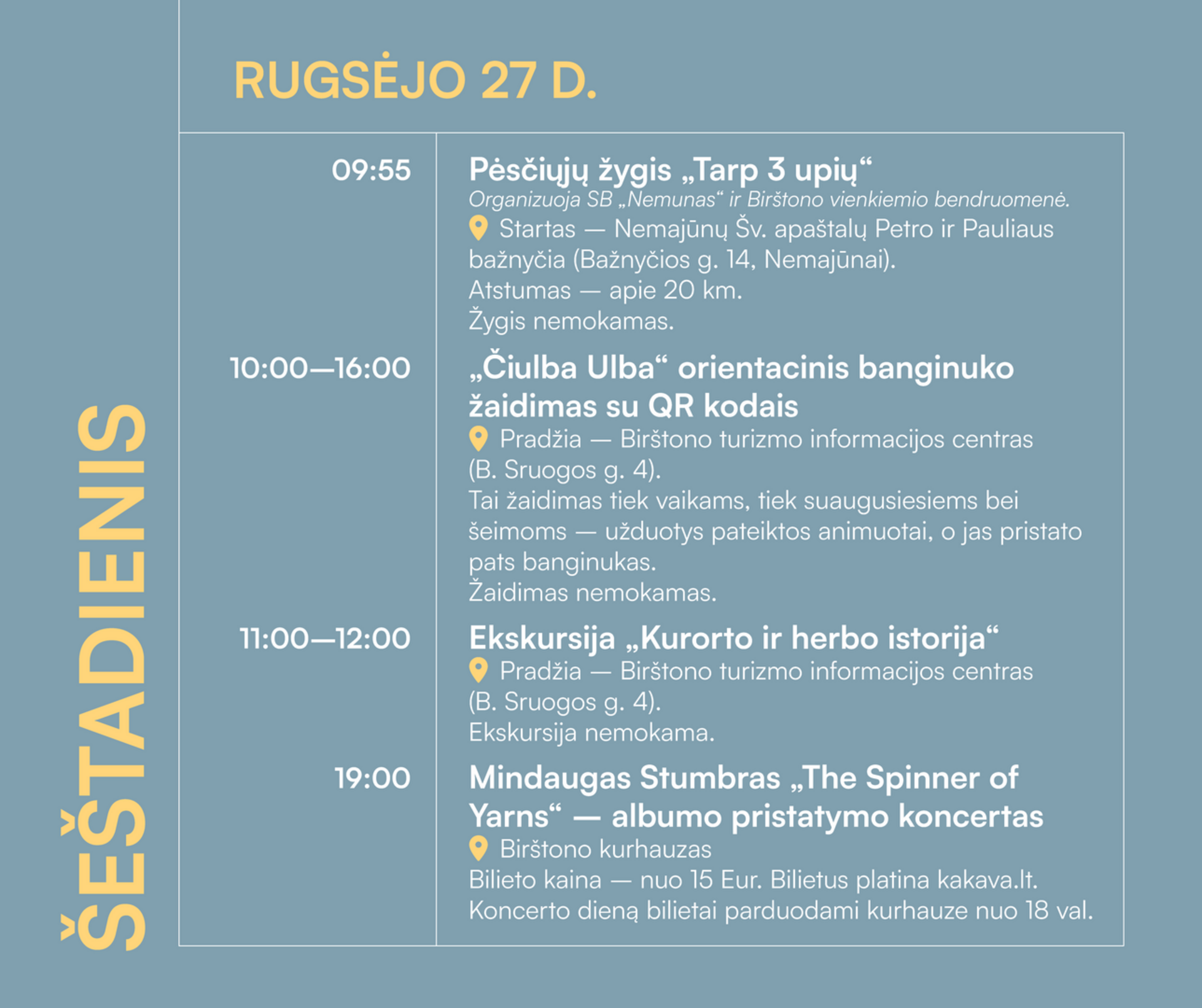19:00 Mindaugas Stumbras „The Spinner of Yarns“ – albumo pristatymo koncertas. Vieta – Birštono kurhauzas. Bilietus platina kakava.lt. Koncerto dieną bilietai parduodami kurhauze nuo 18 val.