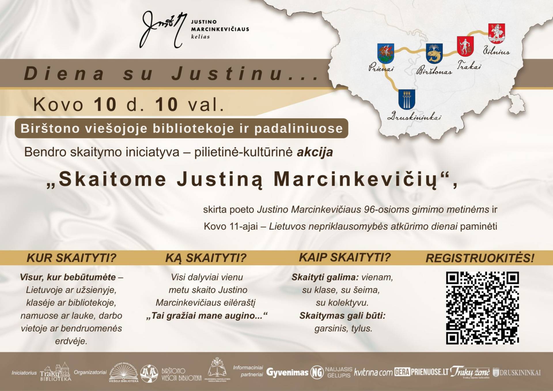 Bendro skaitymo iniciatyva – pilietinė-kultūrinė akcija skirta poeto J. Marcinkevičiaus 96-osioms gimimo metinėms ir Kovo 11-ajai – Lietuvos nepriklausomybės atkūrimo dienai paminėti.
