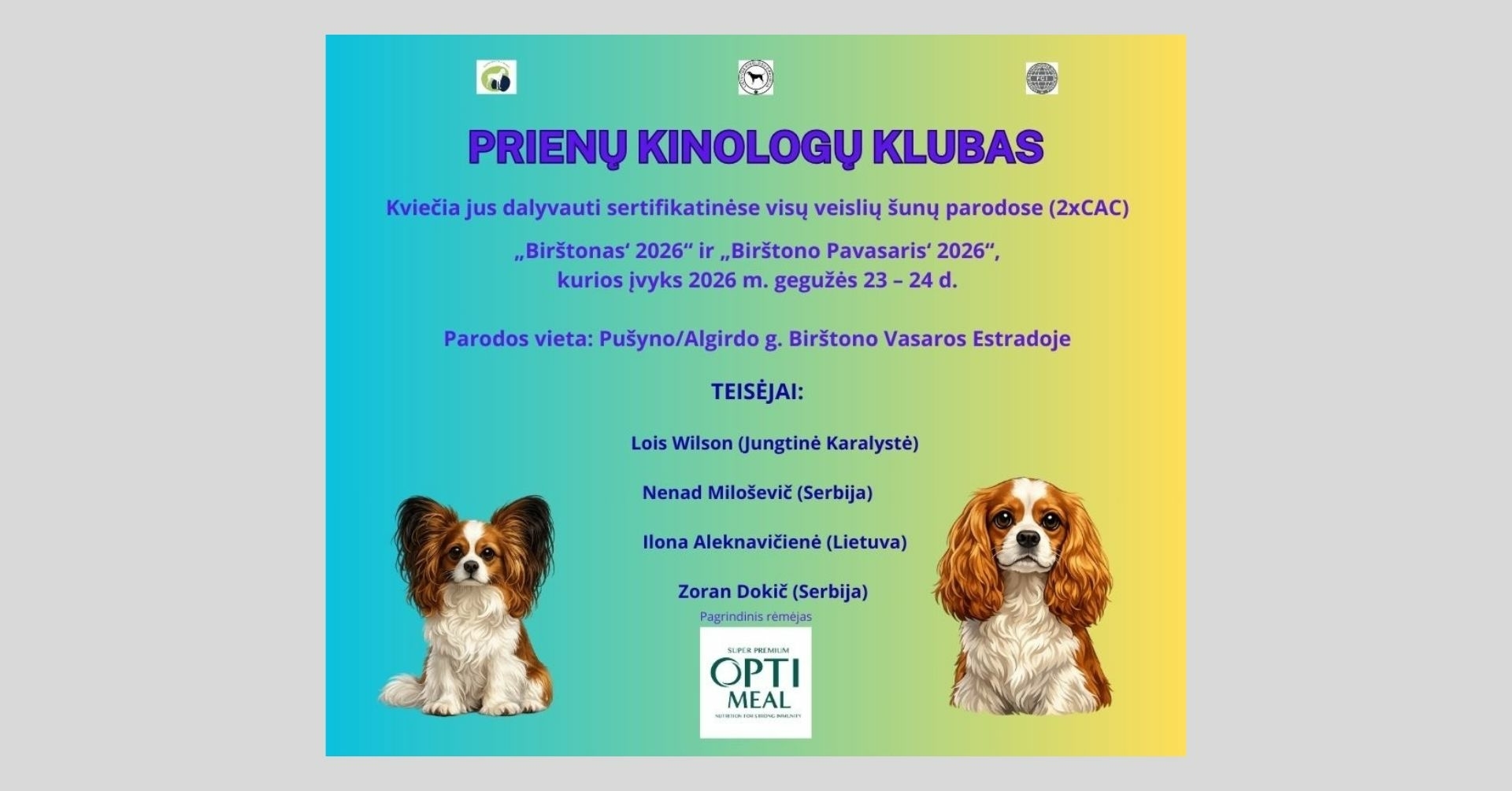 PRIENŲ KINOLOGŲ KLUBAS Kviečia jus dalyvauti sertifikatinėje visų veislių šunų parodoje (CAC) „Birštonas‘ 2026“ ir „Birštono Pavasaris‘ 2026“, kurios įvyks 2026 m. gegužės 23 – 24 d.