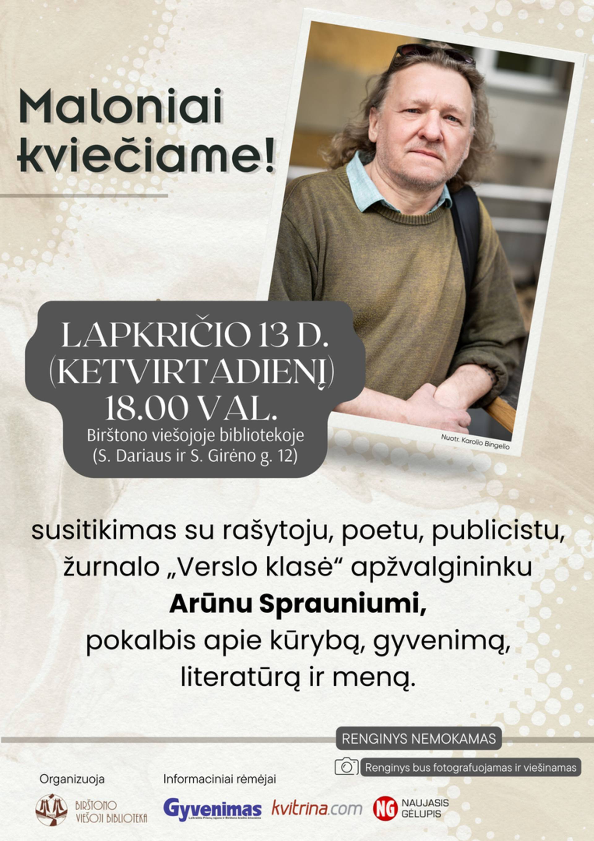 Maloniai kviečiame lapkričio 13 d. (ketvirtadienį) 18 val. Birštono viešojoje bibliotekoje (S. Dariaus ir S. Girėno g. 12) į susitikimą su rašytoju, poetu, publicistu, žurnalo „Verslo klasė“ apžvalgininku Arūnu Sprauniumi. Vakaro metu kalbėsime apie kūrybą, gyvenimą, literatūrą ir meną.