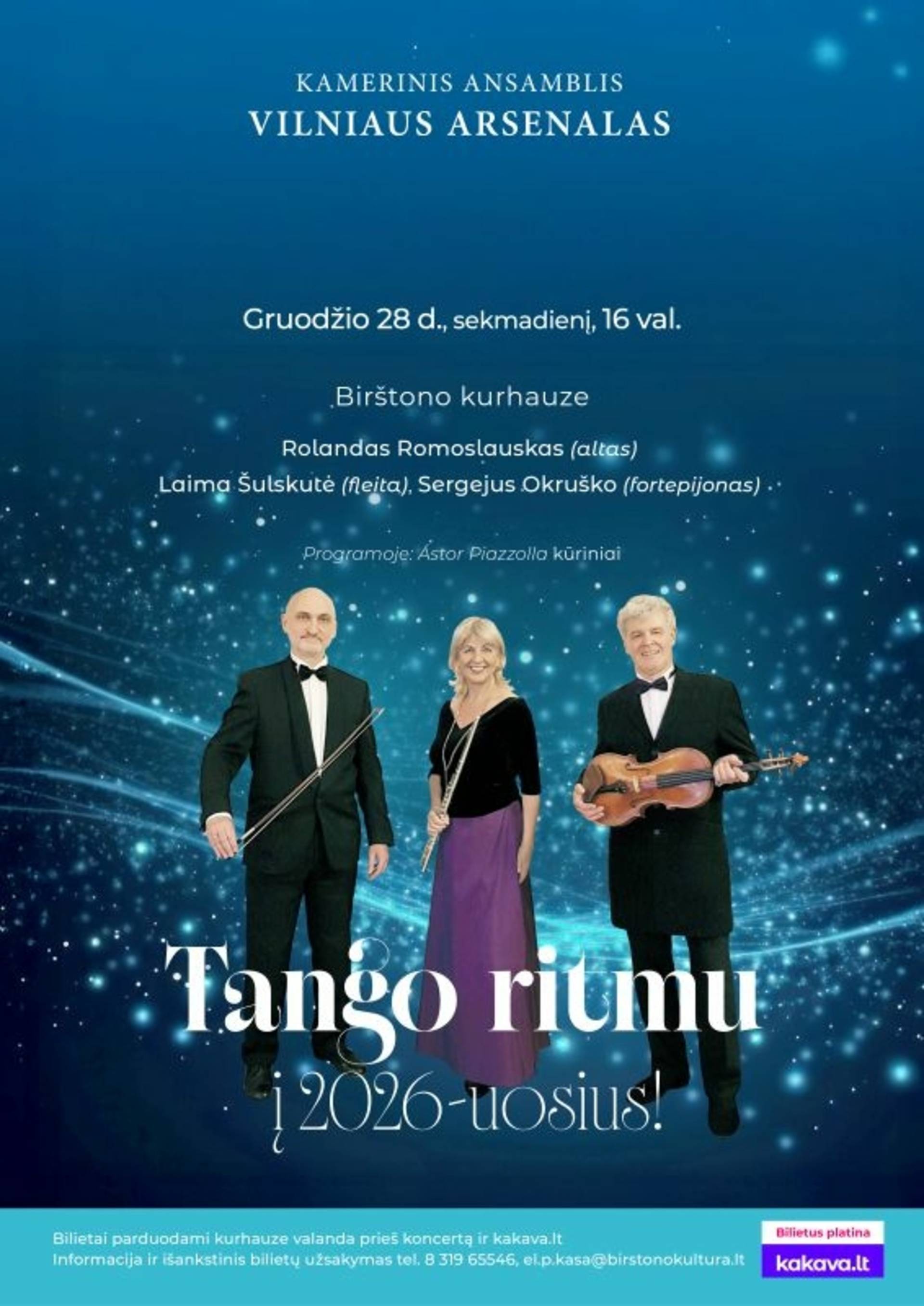 „Man tango visuomet buvo skirtas ausims, o ne kojoms“, – šiuos žodžius pasakęs argentiniečių kompozitorius Astor Piazzolla, vargu ar tikėjosi, kad jo muzika taps tokia populiaria, jog net ir prabėgus daugeliui metų po kūrėjo mirties, tango skamba visur – nuo koncertų salių, iki televizinių reklamų ar filmų. Tradicinis šokis su klasikinės muzikos, džiazo ar netgi roko elementais, viskas nuspalvinta nenusakomu ilgesiu, nostalgija ir aistra. Tai ne tik šokių muzika. Á. Piazzollos kūriniai skirti klausytis ir drauge pasinerti į emocijų kupiną tango istoriją. Gaivališkos, melodramatiškos, tačiau kartu ir aistringai nostalgiškos kompozicijos kvies klausytis ir drauge praleisti paskutines metų akimirkas. Autentiškoje Birštono kurhauzo erdvėje ansamblis „Vilniaus arsenalas“ atliks pluoštą Argentinos kompozitoriaus tango, kurie sukurs nepaprastą vakaro atmosferą.